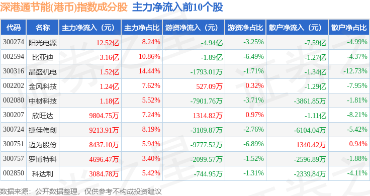 资金流向方面,深港通节能(港币)(983086)指数成份股当日主力资金净流入合计5.11亿元,游资资金净流出合计3.36亿元,散户资金净流出合计1.76亿元。成份股资金流向详情见下表: