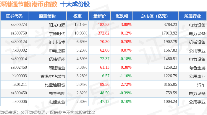深港通节能(港币)(983086)指数十大成份股详情如下: