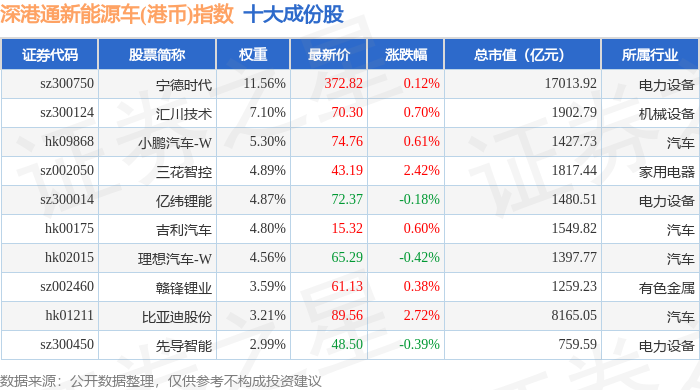 深港通新能源车(港币)(983088)指数十大成份股详情如下: