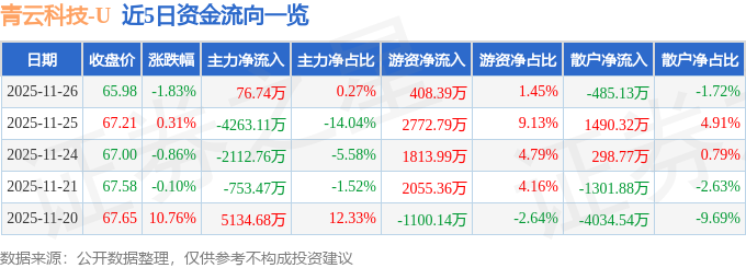 证券之星消息,截至2025年11月26日收盘,青云科技(688316)报收于65.98元,下跌1.83%,换手率8.73%,成交量4.18万手,成交额2.82亿元。