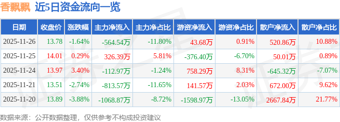11月26日的资金流向数据方面,主力资金净流出564.54万元,占总成交额11.8%,游资资金净流入43.68万元,占总成交额0.91%,散户资金净流入520.86万元,占总成交额10.88%。