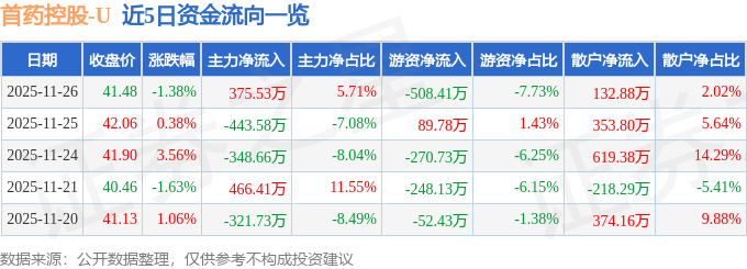 证券之星消息,截至2025年11月26日收盘,首药控股(688197)报收于41.48元,下跌1.38%,换手率2.42%,成交量1.55万手,成交额6576.85万元。
