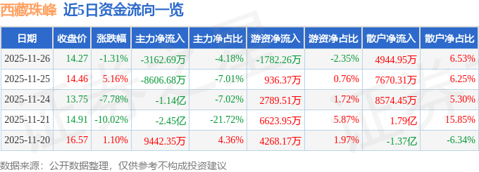 证券之星消息,截至2025年11月26日收盘,西藏珠峰(600338)报收于14.27元,下跌1.31%,换手率5.75%,成交量52.53万手,成交额7.57亿元。