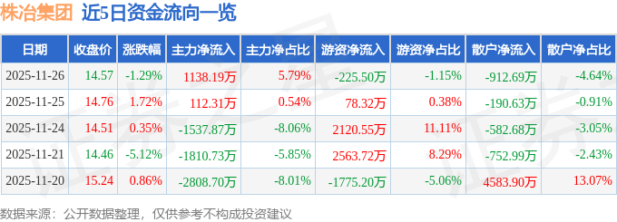 证券之星消息,截至2025年11月26日收盘,株冶集团(600961)报收于14.57元,下跌1.29%,换手率1.78%,成交量13.36万手,成交额1.97亿元。