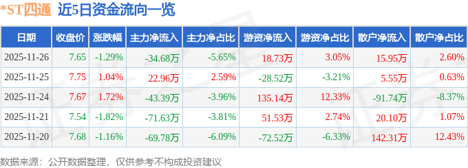 证券之星消息,截至2025年11月26日收盘,*ST四通(603838)报收于7.65元,下跌1.29%,换手率0.25%,成交量7996.0手,成交额613.3万元。