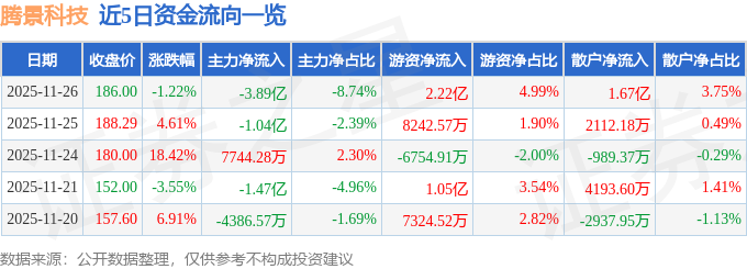 证券之星消息,截至2025年11月26日收盘,腾景科技(688195)报收于186.0元,下跌1.22%,换手率18.11%,成交量23.43万手,成交额44.47亿元。