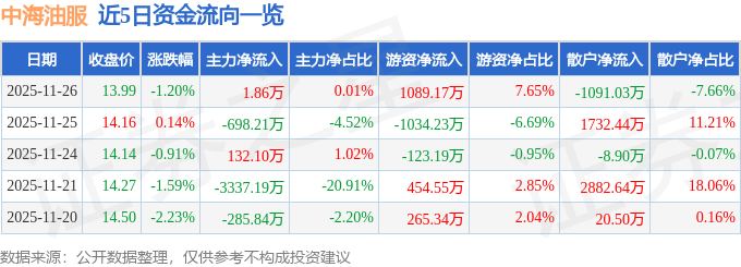 证券之星消息,截至2025年11月26日收盘,中海油服(601808)报收于13.99元,下跌1.2%,换手率0.34%,成交量10.15万手,成交额1.42亿元。