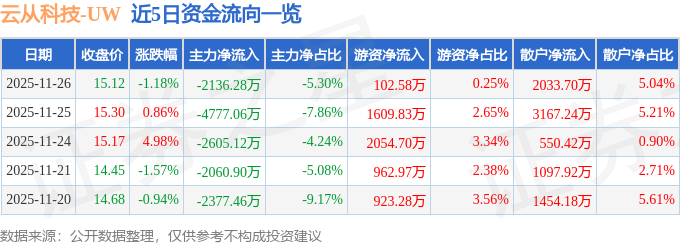 11月26日的资金流向数据方面,主力资金净流出2136.28万元,占总成交额5.3%,游资资金净流入102.58万元,占总成交额0.25%,散户资金净流入2033.7万元,占总成交额5.04%。