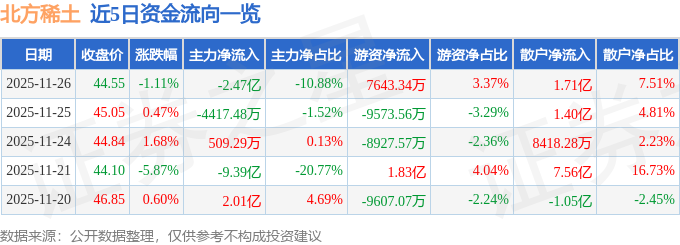 证券之星消息,截至2025年11月26日收盘,北方稀土(600111)报收于44.55元,下跌1.11%,换手率1.41%,成交量50.81万手,成交额22.7亿元。