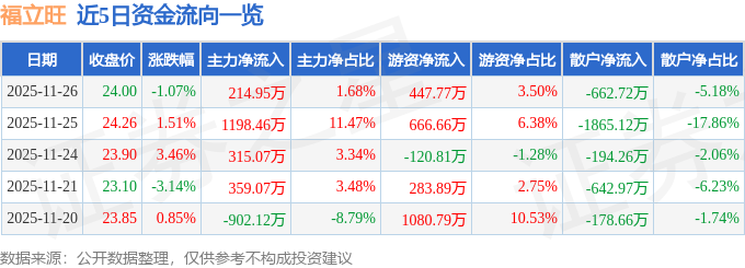 证券之星消息,截至2025年11月26日收盘,福立旺(688678)报收于24.0元,下跌1.07%,换手率2.04%,成交量5.31万手,成交额1.28亿元。