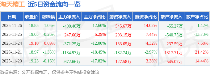 证券之星消息,截至2025年11月26日收盘,海天精工(601882)报收于18.85元,下跌1.05%,换手率0.39%,成交量2.06万手,成交额3892.03万元。
