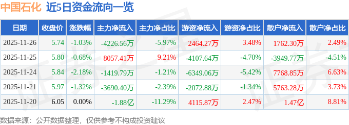 证券之星消息,截至2025年11月26日收盘,中国石化(600028)报收于5.74元,下跌1.03%,换手率0.13%,成交量122.87万手,成交额7.08亿元。