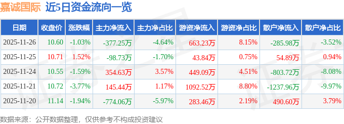 证券之星消息,截至2025年11月26日收盘,嘉诚国际(603535)报收于10.6元,下跌1.03%,换手率1.5%,成交量7.68万手,成交额8133.66万元。