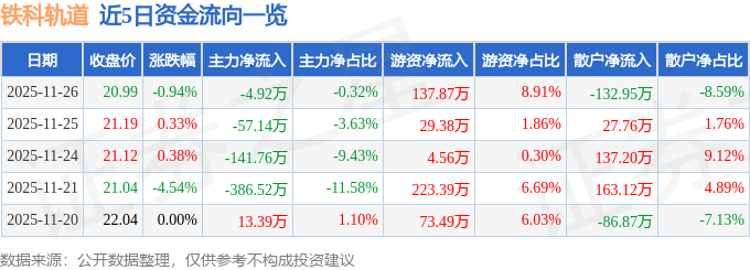 证券之星消息,截至2025年11月26日收盘,铁科轨道(688569)报收于20.99元,下跌0.94%,换手率0.35%,成交量7335.0手,成交额1547.99万元。