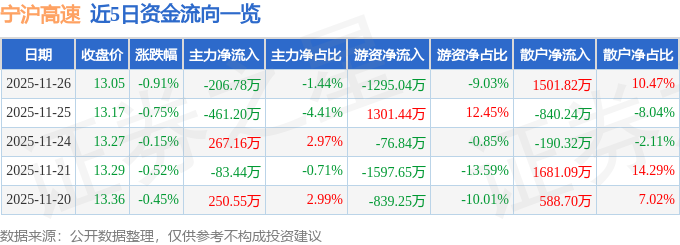 证券之星消息,截至2025年11月26日收盘,宁沪高速(600377)报收于13.05元,下跌0.91%,换手率0.29%,成交量10.95万手,成交额1.43亿元。