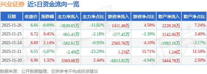 证券之星消息,截至2025年11月26日收盘,兴业证券(601377)报收于6.66元,下跌0.89%,换手率0.53%,成交量46.14万手,成交额3.08亿元。