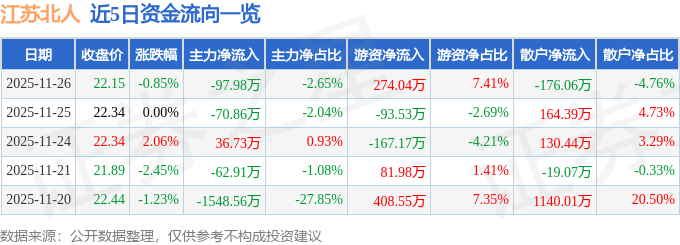 证券之星消息,截至2025年11月26日收盘,江苏北人(688218)报收于22.15元,下跌0.85%,换手率1.4%,成交量1.66万手,成交额3700.26万元。