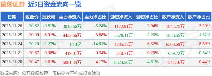 证券之星消息,截至2025年11月26日收盘,首创证券(601136)报收于20.82元,下跌0.81%,换手率5.73%,成交量27.61万手,成交额5.75亿元。