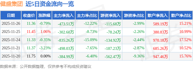 11月26日的资金流向数据方面,主力资金净流出473.51万元,占总成交额12.22%,游资资金净流出115.68万元,占总成交额2.99%,散户资金净流入589.19万元,占总成交额15.21%。