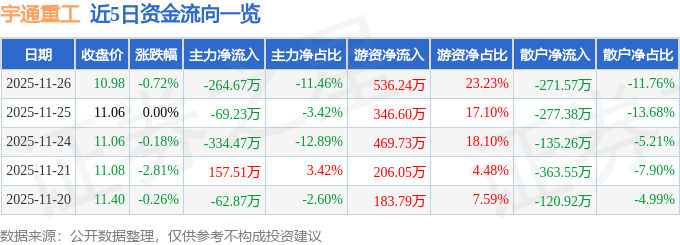 11月26日的资金流向数据方面,主力资金净流出264.67万元,占总成交额11.46%,游资资金净流入536.24万元,占总成交额23.23%,散户资金净流出271.57万元,占总成交额11.76%。