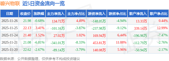 证券之星消息,截至2025年11月26日收盘,碧兴物联(688671)报收于21.98元,下跌0.68%,换手率2.87%,成交量1.34万手,成交额2997.67万元。