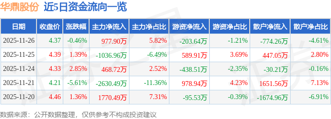 证券之星消息,截至2025年11月26日收盘,华鼎股份(601113)报收于4.37元,下跌0.46%,换手率3.48%,成交量38.4万手,成交额1.68亿元。