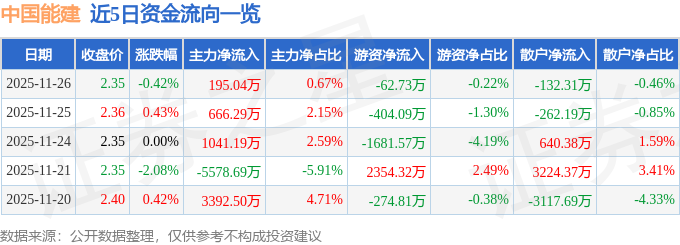 证券之星消息,截至2025年11月26日收盘,中国能建(601868)报收于2.35元,下跌0.42%,换手率0.38%,成交量122.86万手,成交额2.9亿元。