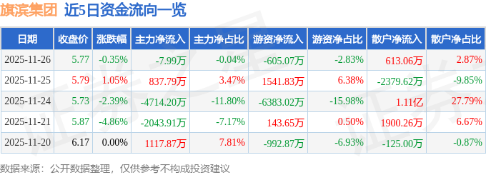 证券之星消息,截至2025年11月26日收盘,旗滨集团(601636)报收于5.77元,下跌0.35%,换手率1.3%,成交量37.09万手,成交额2.14亿元。