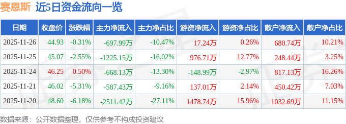 证券之星消息,截至2025年11月26日收盘,赛恩斯(688480)报收于44.93元,下跌0.31%,换手率1.55%,成交量1.48万手,成交额6665.31万元。