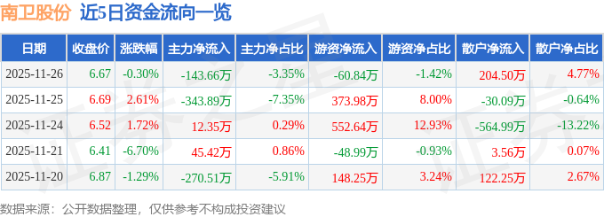证券之星消息,截至2025年11月26日收盘,南卫股份(603880)报收于6.67元,下跌0.3%,换手率2.19%,成交量6.34万手,成交额4286.55万元。