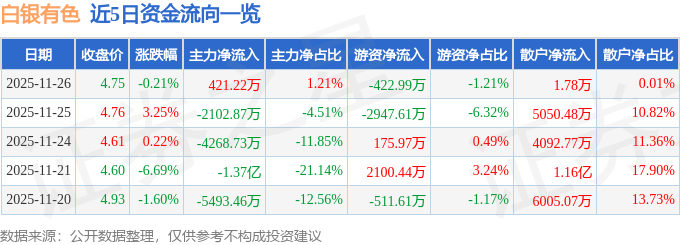 证券之星消息,截至2025年11月26日收盘,白银有色(601212)报收于4.75元,下跌0.21%,换手率0.99%,成交量73.3万手,成交额3.49亿元。