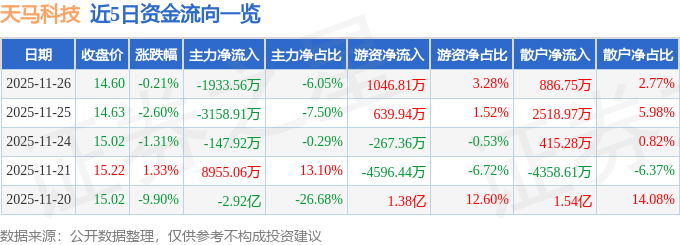 证券之星消息,截至2025年11月26日收盘,天马科技(603668)报收于14.6元,下跌0.21%,换手率4.38%,成交量22.12万手,成交额3.2亿元。