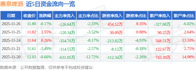 证券之星消息,截至2025年11月26日收盘,惠泉啤酒(600573)报收于11.8元,下跌0.17%,换手率1.84%,成交量4.6万手,成交额5445.27万元。