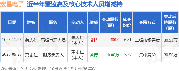 证券之星消息,根据11月26日市场公开信息、上市公司公告及交易所披露数据整理,宏昌电子(603002)最新董监高及相关人员股份变动情况:2025年11月26日公司高级管理人员萧志仁共增持公司股份300.0股,占公司总股本为0.0001%。变动期间公司股价下跌0.87%,11月26日当日收盘报6.83元。