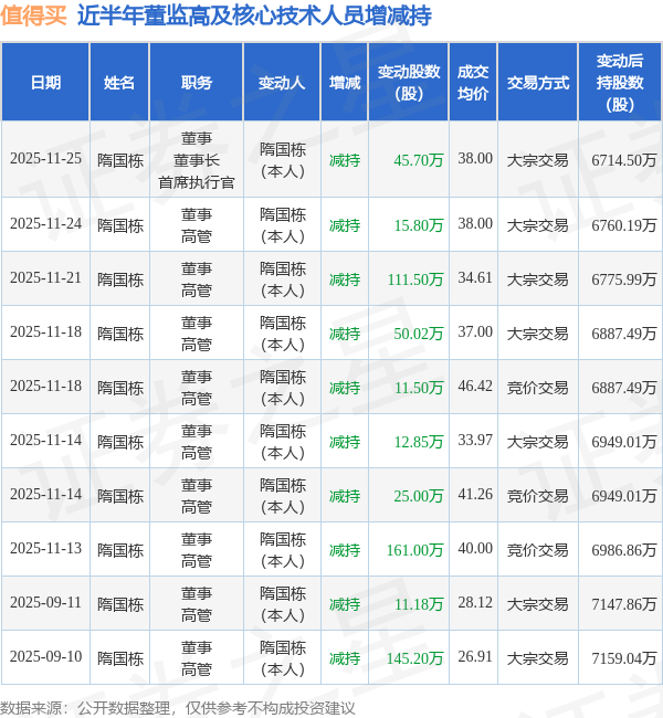 证券之星消息,根据11月26日市场公开信息、上市公司公告及交易所披露数据整理,值得买(300785)最新董监高及相关人员股份变动情况:2025年11月25日公司董事,董事长,首席执行官隋国栋共减持公司股份45.7万股,占公司总股本为0.2298%。变动期间公司股价上涨8.94%,11月25日当日收盘报51.2元。