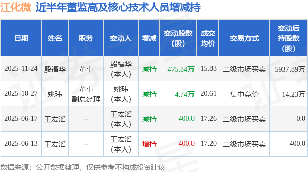 江化微近半年内的董监高及核心技术人员增减持详情如下: