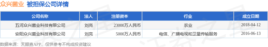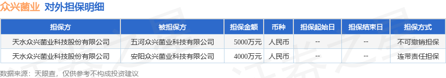 众兴菌业11月25日披露2笔对外担保,被担保公司2家。对外担保明细如下表: