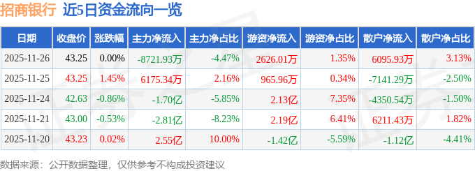 证券之星消息,截至2025年11月26日收盘,招商银行(600036)报收于43.25元,上涨0.0%,换手率0.22%,成交量45.11万手,成交额19.51亿元。