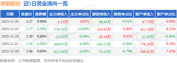 证券之星消息,截至2025年11月26日收盘,凌钢股份(600231)报收于2.27元,上涨0.0%,换手率0.83%,成交量23.4万手,成交额5357.5万元。