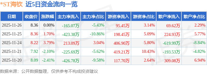 证券之星消息,截至2025年11月26日收盘,*ST海钦(600753)报收于8.36元,上涨0.0%,换手率1.57%,成交量3.62万手,成交额3039.1万元。
