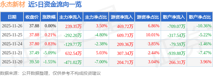 证券之星消息,截至2025年11月26日收盘,永杰新材(603271)报收于37.88元,上涨0.0%,换手率4.55%,成交量1.79万手,成交额6846.27万元。