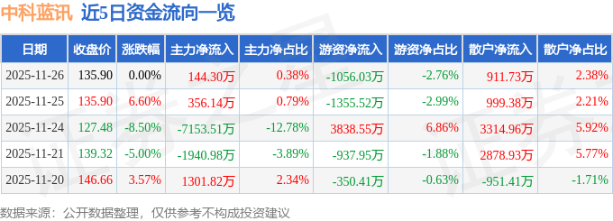 证券之星消息,截至2025年11月26日收盘,中科蓝讯(688332)报收于135.9元,上涨0.0%,换手率6.31%,成交量2.79万手,成交额3.83亿元。
