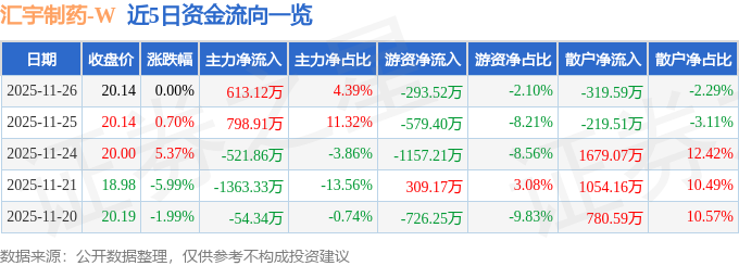 证券之星消息,截至2025年11月26日收盘,汇宇制药(688553)报收于20.14元,上涨0.0%,换手率1.97%,成交量6.78万手,成交额1.4亿元。