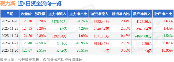 证券之星消息,截至2025年11月26日收盘,赛力斯(601127)报收于125.1元,上涨0.2%,换手率0.83%,成交量12.57万手,成交额15.7亿元。