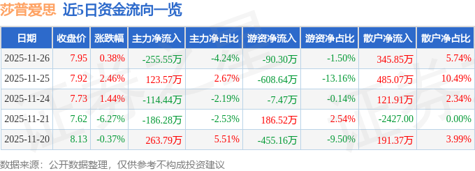 11月26日的资金流向数据方面,主力资金净流出255.55万元,占总成交额4.24%,游资资金净流出90.3万元,占总成交额1.5%,散户资金净流入345.85万元,占总成交额5.74%。