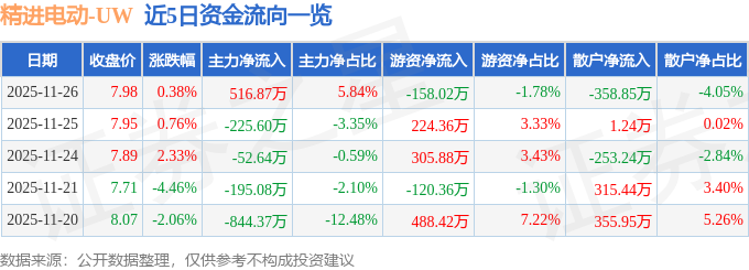 证券之星消息,截至2025年11月26日收盘,精进电动(688280)报收于7.98元,上涨0.38%,换手率2.11%,成交量11.01万手,成交额8856.69万元。