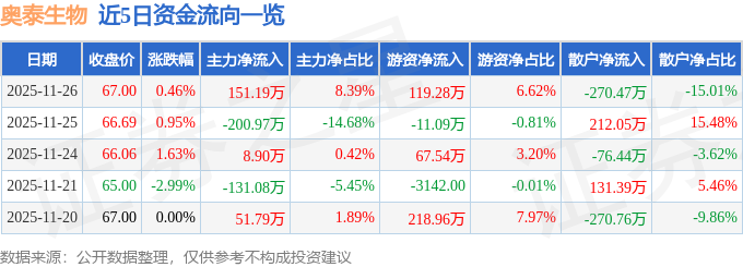 证券之星消息,截至2025年11月26日收盘,奥泰生物(688606)报收于67.0元,上涨0.46%,换手率0.34%,成交量2692.0手,成交额1801.72万元。