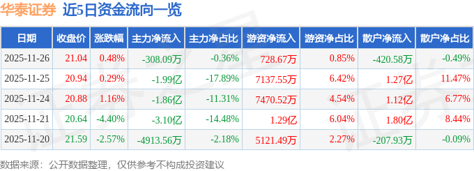证券之星消息,截至2025年11月26日收盘,华泰证券(601688)报收于21.04元,上涨0.48%,换手率0.56%,成交量40.69万手,成交额8.56亿元。