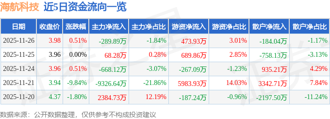 证券之星消息,截至2025年11月26日收盘,海航科技(600751)报收于3.98元,上涨0.51%,换手率1.54%,成交量39.58万手,成交额1.58亿元。