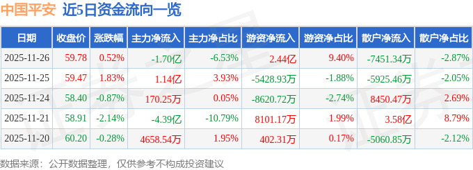 证券之星消息,截至2025年11月26日收盘,中国平安(601318)报收于59.78元,上涨0.52%,换手率0.41%,成交量43.47万手,成交额25.98亿元。